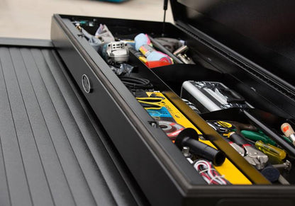 The Truck Covers USA American Work Cover is your solution for work and play. It offers the stylish design and superior construction of a toolbox and roll cover in one. The toolbox was designed with work trucks in mind. It offers a lower section that is 10 inches wide and 9.5 inches deep. While the upper section is larger measuring at 20 inches wide and 5.5 inches deep. This toolbox and cover combo comes ready to use with two black powder coated steel trays. (Stainless Steel trays available at additional cost). The cover has a sleek low-profile design that is available for virtually all trucks on the market today. Constructed from double walled light weight aluminum the Truck Covers USA American Work Cover can support up to 500lbs of evenly distributed weight. The Work Cover is a retractable truck bed cover that operates smoothly and effortlessly thanks to its tension-driven design. It can accommodate cargo of any size and automatically locks into place every 12 inches, providing just the right amount of protection and security.